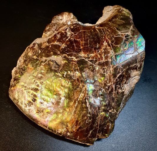 The tremendous iridescence of Ammolite is due to the microstructure of the numerous aragonite layers. Ammolite has been compared to the most expensive Black Opal. Ocular Dynamics is the visual experience achieved when rotating and moving the Ammolite around a central light source to expose the gemstone's natural beauty.